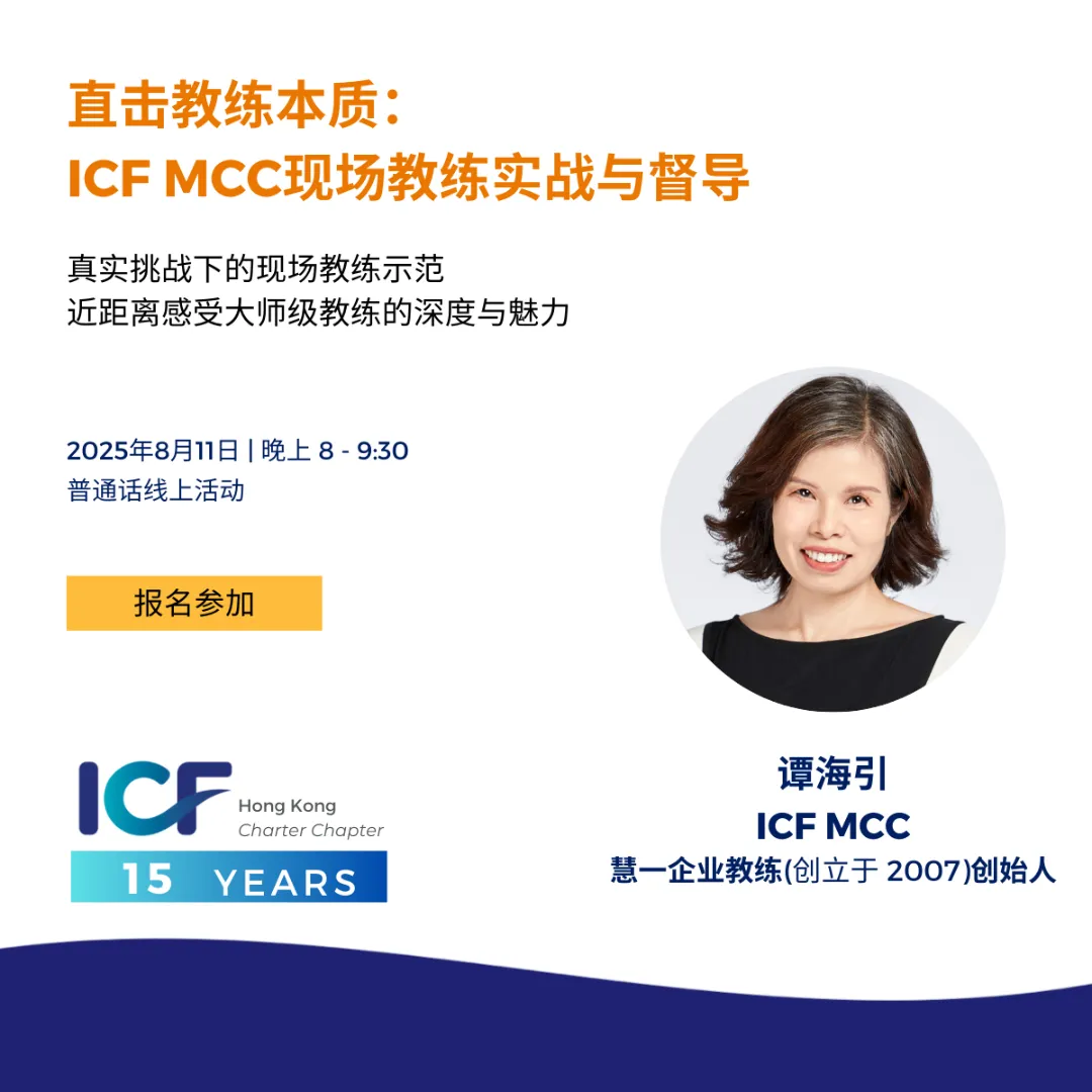 我们非常荣幸邀请到 ICF 国际教练联合会大师级教练(MCC)谭海引老师,带来一场真实挑战中的现场教练示范,为专业教练们打造一次高质量的学习体验。